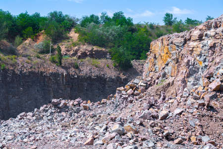 Rocky career for a coal mining on a summer day and a hill on the horizon without people