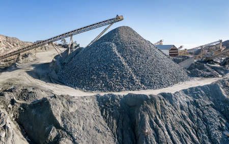 Aerial view of stone jaw crusher plant. Sand making plant and belt conveyor in mining quarry. Sand crushing and bulk materials for construction
