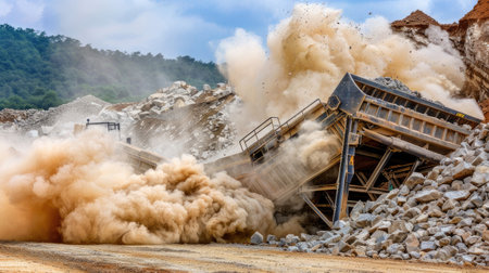 Dusty industrial landscape, featuring a working stone crusher, a long conveyor belt, and a quarry engineer ensuring smooth operation.