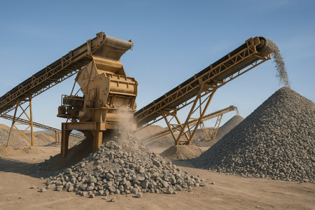 Industrial mining operations with conveyor belts and machinery in action on construction site for material extraction and processing during daytime work.