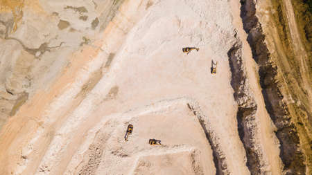 Opencast Sand quarry, industrial extraction of sand for construction industry. Excavators and tractors load crushed stone and rock into dump trucks
