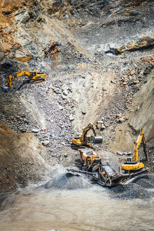 Industrial machinery and heavy duty excavators working at rock quarry. Industrial rock breaker working