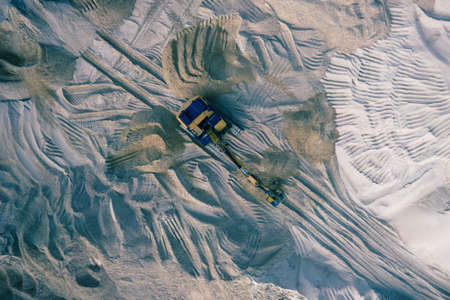 Aerial view of excavator loading sand into empty dump truck in open air sand ballast quarry