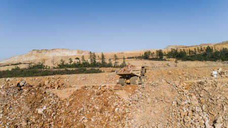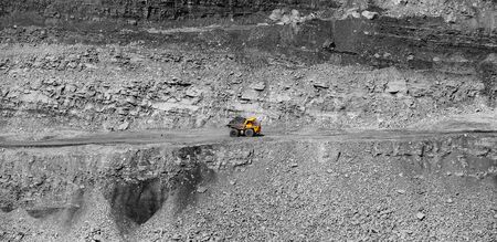 Huge yellow mining dump truck working in granite quarry. Mining industry