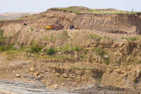 Open pit mining of construction sand stone materials with excavators and dump trucks.