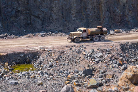 The tank truck wets water the surface of the road in a quarry open pit mining of granite stone. Process production stone and gravel. Quarry mining equipment.