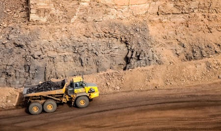 Big yellow mining truck coal transportation. Open pit mine industry.