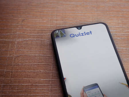 Lod, Israel - July 8, 2020: Quizlet - Language learning app launch screen with logo on the display of a black mobile smartphone on wooden background. Top view flat lay with copy space.