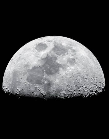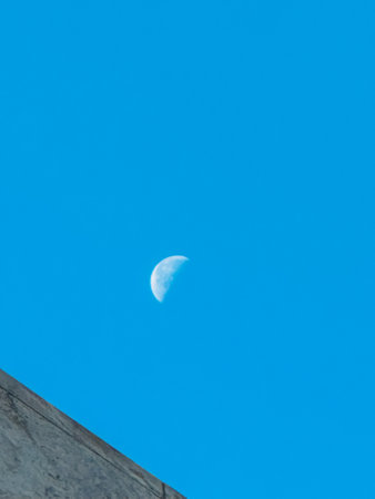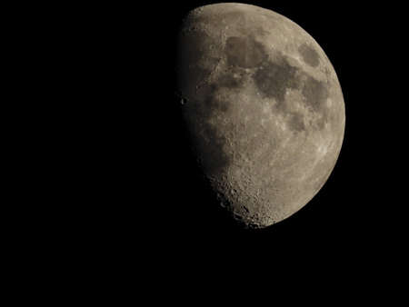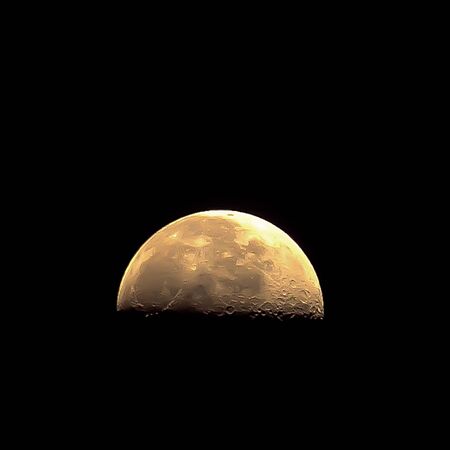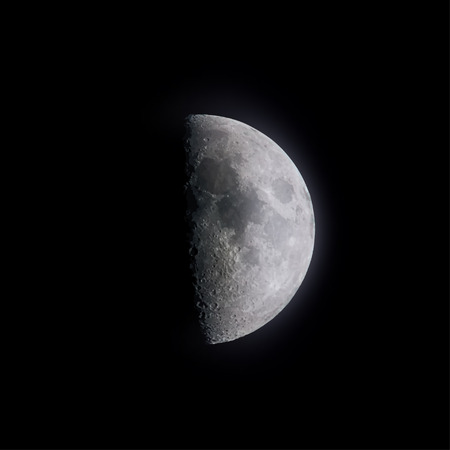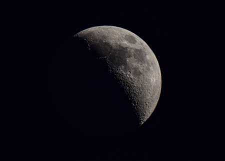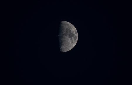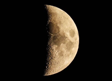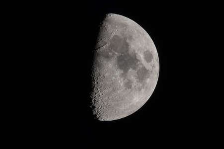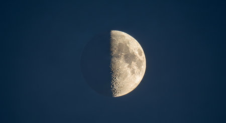 First quarter moon seen with an astronomical telescope, dark blue sky
