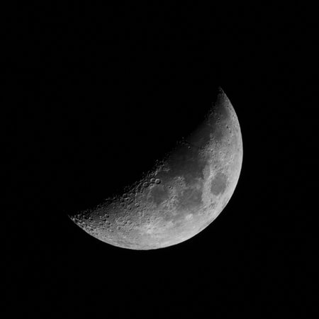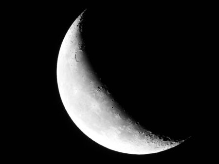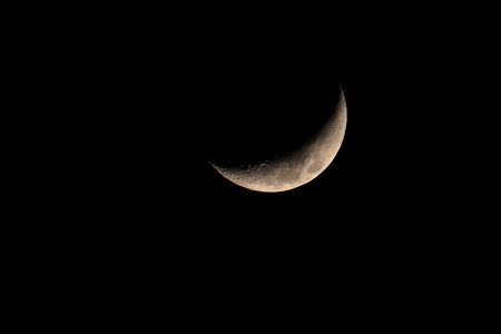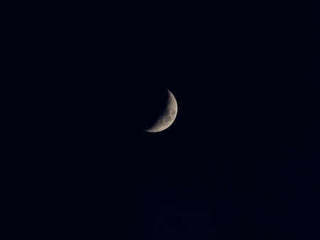 the increasing sickle-shaped quarter moon with its moon craters stands in the black night sky