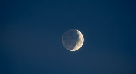 A clear, high-definition photograph of the moon in its waxing gibbous phase, set against a deep, dark blue sky, likely during twilight. The sunlight illuminates the craters and textures on the right side of the lunar surface, while the left side fades into shadow. The image captures the beauty and serenity of space and astronomy.