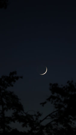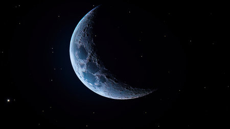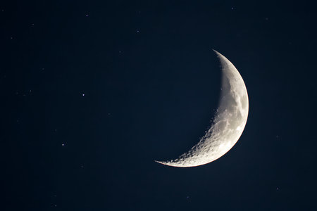 Delicate crescent moon illuminates the night sky amidst twinkling stars and serene darkness