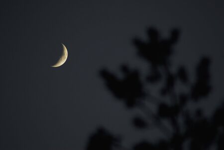 Waxing crescent in the sky, a view from the ground to the illuminated crescent moon.
