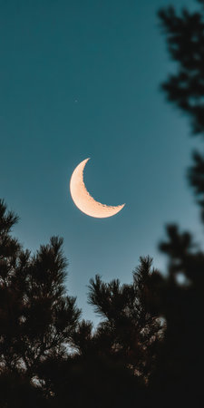 A breathtaking view of a crescent moon gracefully hanging in the night sky, surrounded by shimmering stars, creating a captivating celestial atmosphere.