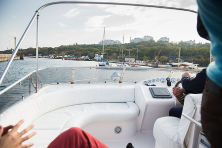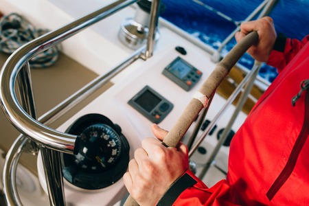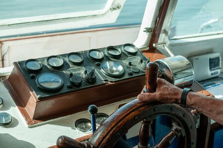 Hand of captain on steering wheel of motor boat in the blue ocean during the fishery day. Boat or yacht captain hand on boat steering wheel. close up. Success fishing concept.