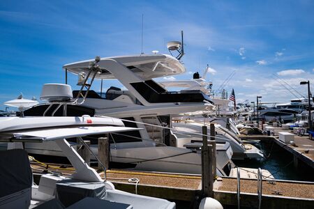 Luxury yacht in the port. The coast of the Atlantic Ocean. Rich life in Miami. Things to do in Miami Beach. Beautiful white luxury yachts for a relaxing holiday. Summer in US.