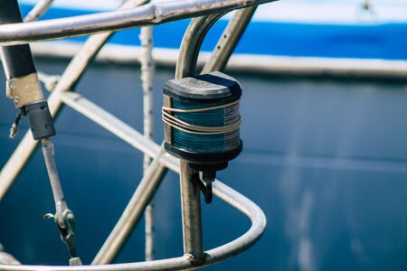 Close up of yacht equipment. Part of yacht with red ropes and capstan. Sailing boat pulley with nautical rope. Marine background.