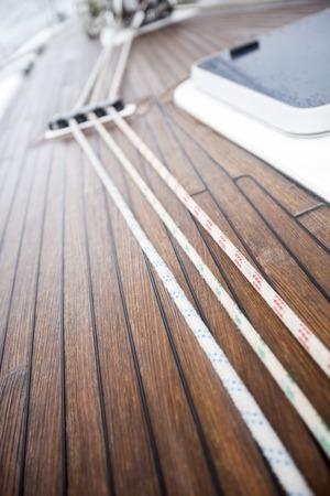 Rope on a yacht. Yacht rope cleat and sunlight. Sailboat winch and rope yacht detail. Yachting.