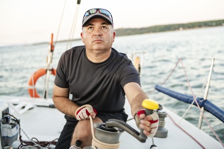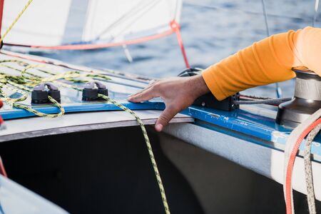 Close up of hands coiling up a rope, sheet around a winch on a sailboat