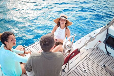 Woman and man sitting on the ship deck enjoying the moment on a sunny day