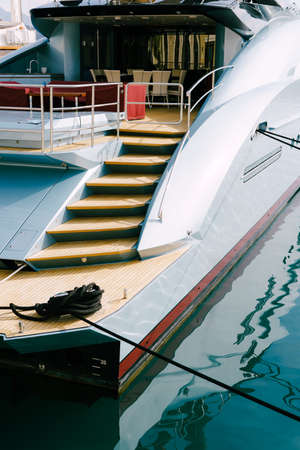 Side view of a stern trawl of beautiful motor white yacht moored to the pier