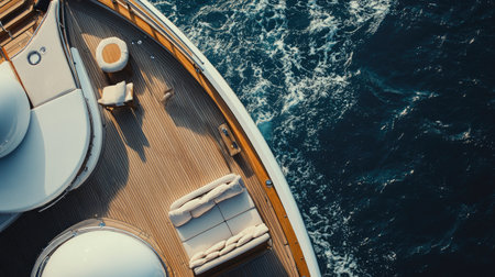 A close-up aerial view of a yacht's deck, with luxurious seating and sun loungers, emphasizing the comfort and elegance of life aboard on a sunny day.
