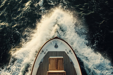 A motor yacht cuts through chaotic waves, leaving a trail of white foam behind. The vessel glides gracefully on the open water, showing the power of the sea as it moves forward.