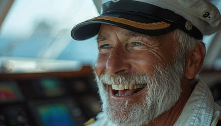 An elderly man with a kind smile, wearing a captains hat, enjoys a peaceful day on a boat as he gazes out at the sea under the warm sun.
