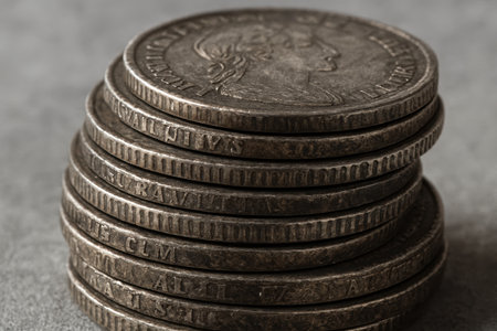 Neat stack of antique tarnished silver coins, showcasing intricate details and historical value. represents wealth, finance, and investment.