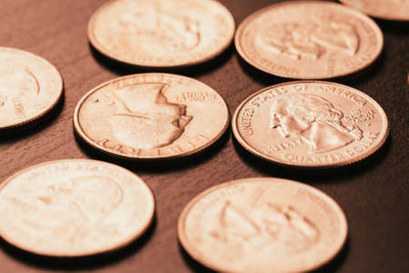 Coins of United States of America on a dark background. Selective focus. Toned.