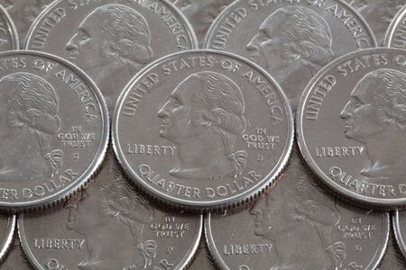 Piles of US American coins of 15 cents quarters close-up. Illustration for news about the national currency, the dollar, the state budget, the Fed, inflation and the refinancing rate. Macro
