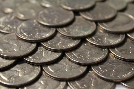 American coins closeup including quarters, nickels and dimes, selective focus. One dime