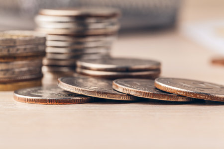 A stack of various coins sits neatly arranged on a wooden table, reflecting light and creating a sense of wealth and stability.