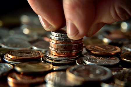 Stacks of coins are carefully arranged on a table with soft lighting.