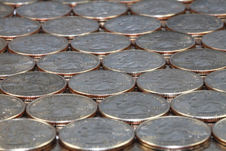 Pattern of US Dollar coins. Pennies dimes and quarter coins from USA. Money background