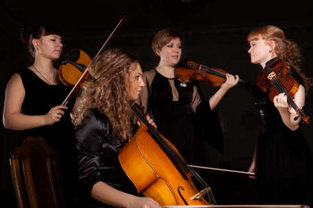 The Young Woman Playing The Cello Is Sitting In Front Of Her Colleagues On The Cosy Sofa. Three Other Women Are Playing Violins.
