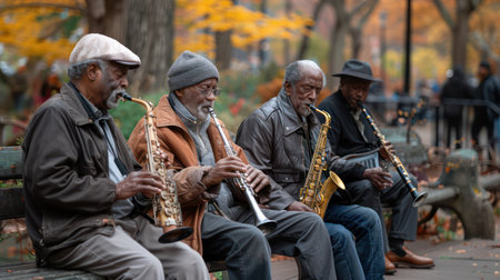 A group of elderly men gathered to play woodwind instruments. Their music is full of beautiful charm. Their instruments glittered in the sunlight.
