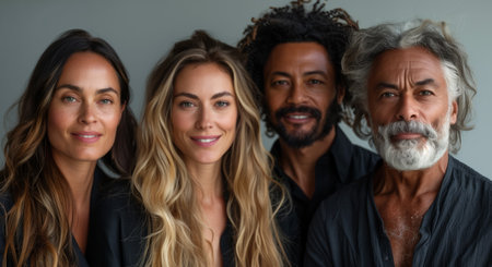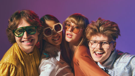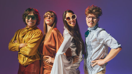 Close up retro disco group in vibrant 70s fashion smiling. Concept of pop culture nostalgia, entertainment promotion, and cultural lifestyle in vintage aesthetics.