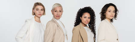 Multiethnic businesswomen in formal wear looking at camera isolated on grey, banner