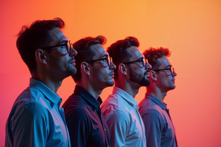 Graphic portrait of diverse music band composing new album in professional recording studio behind glass wall