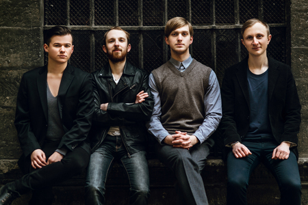 Four young men standing in full length near the wall, looking in different directions, over white background
