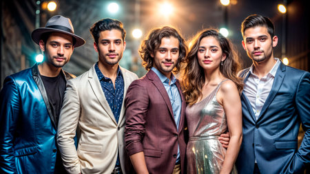 Group of charming party makers celebrating joyfully at a stylish event in an elegant venue during evening hours with vibrant expressions and fashionably chic attire