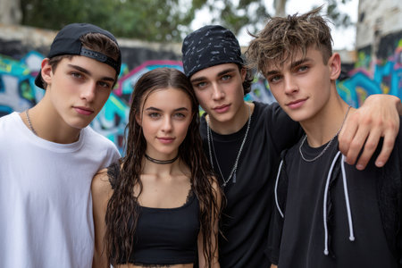 Four young friends stand confidently together, smiling under the urban sun, surrounded by colorful graffiti.