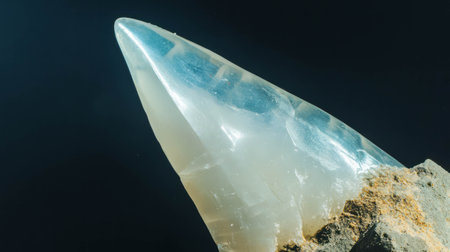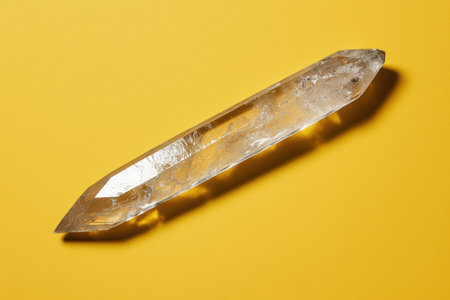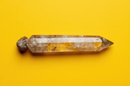 A striking quartz crystal stands upright against a vibrant purple background. The unique texture and shape of the crystal make it an eye-catching piece for various artistic and decorative uses. ai generated.