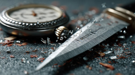 An antique compass rests beside a beautifully crafted knife on a dark, textured surface. Sparkling glass shards are spread around, creating a captivating juxtaposition of materials.