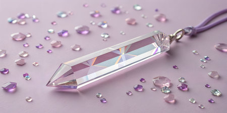 Shimmering clear crystal pendant. Iridescent facets reflecting light. Gemstone jewelry on a soft lavender background. Surrounded by scattered smaller amethyst shards. Healing crystal imagery. Elegant spiritual accessory. Magical sparkle. Unique design element. Meditation tool. Feminine aesthetic. Precious stones display.
