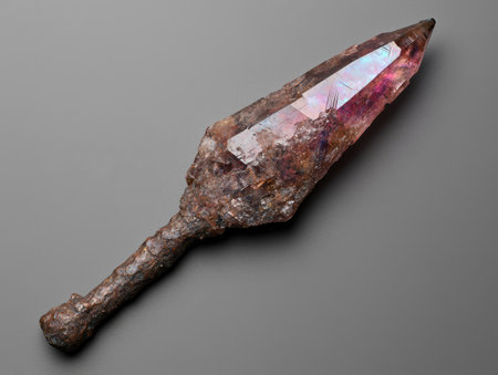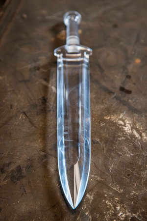 A stunning crystal sword featuring a beautifully ornate handle rests on a smooth surface. The blade glimmers with shades of pink and blue, creating a mesmerizing effect that draws attention against a soft gradient backdrop.