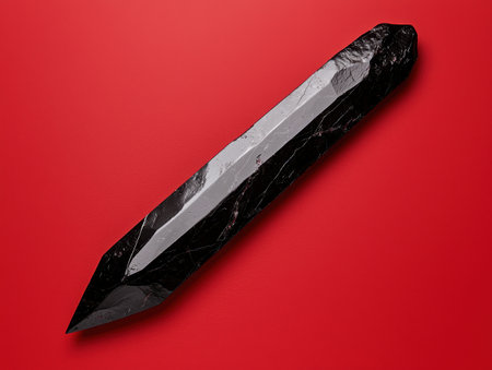 This image showcases an ancient stone tool resting on a rugged brown surface, highlighting its sharp edge and intricate craftsmanship, perfect for historical contexts.