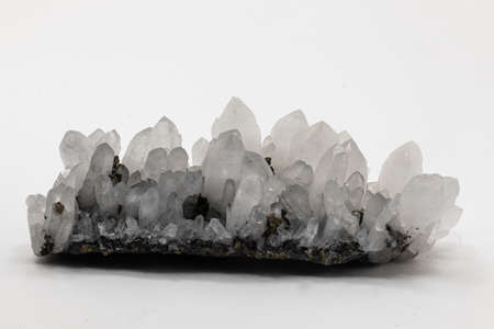 Natural quartz crystals in a pot on a white background. Macro.
