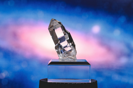 Closeup picture of pure quartz mineral gemstone isolated on a gray background